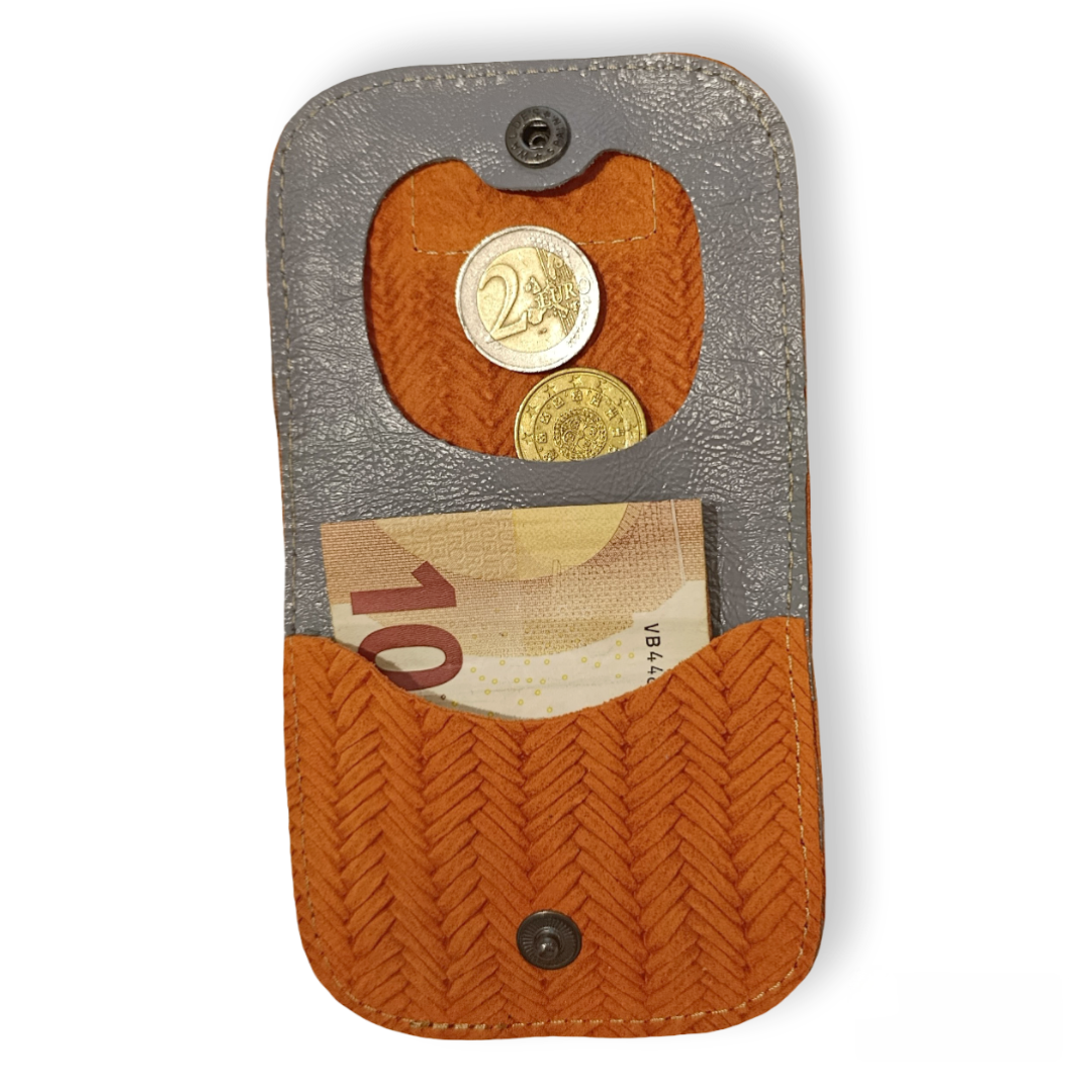 Su forma plana lo hace muy cómodo de llevar, se adapta perfectamente al bolsillo y apenas ocupa espacio. Gracias a su elaboración artesanal, es un monedero resistente y duradero, pensado para acompañarte durante muchos años.